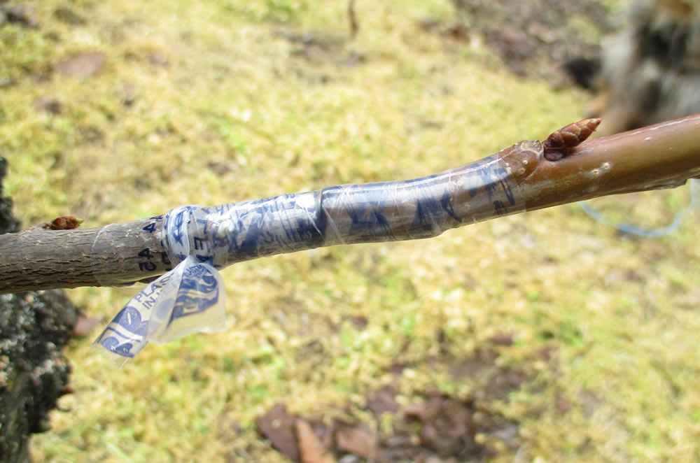 Y lo atamos con plásticos o cintas de injertar, aplicando presión para asegurar un mayor contacto entre espiga y patrón y siempre desde abajo hacia arriba, de forma que el plástico quede en forma de tejadillo y deje la zona sellada herméticamente.
