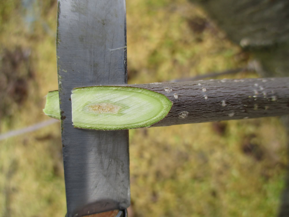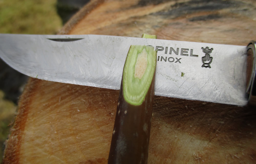Seleccionamos una espiga de un grosor similar al del patrón y repetimos el proceso, el bisel debe ser lo mas parecido posible en dimensiones al del patrón para garantizar la mayor zona de contacto entre ambos, a la espiga no dejarla mas de dos o tres yemas.